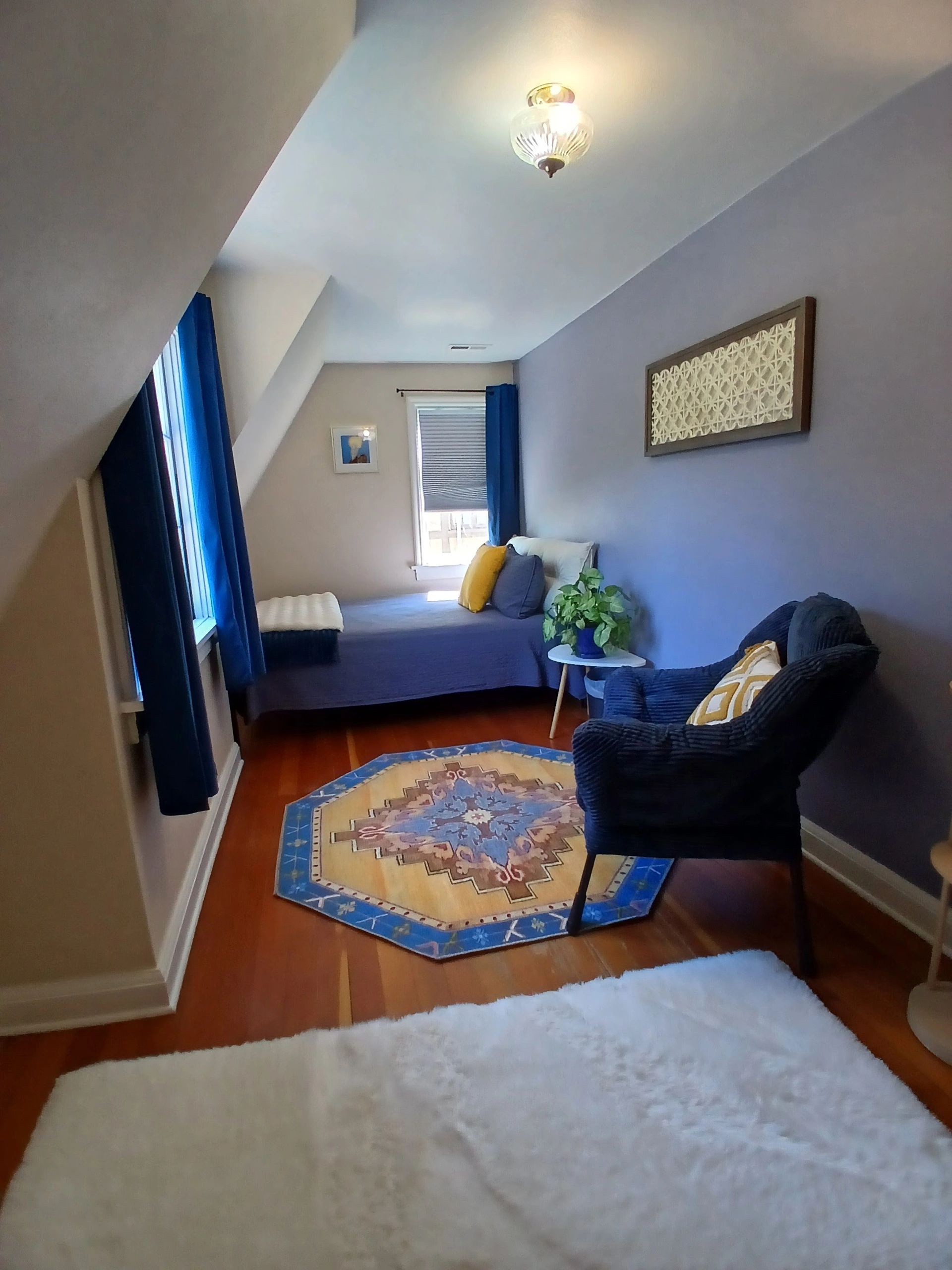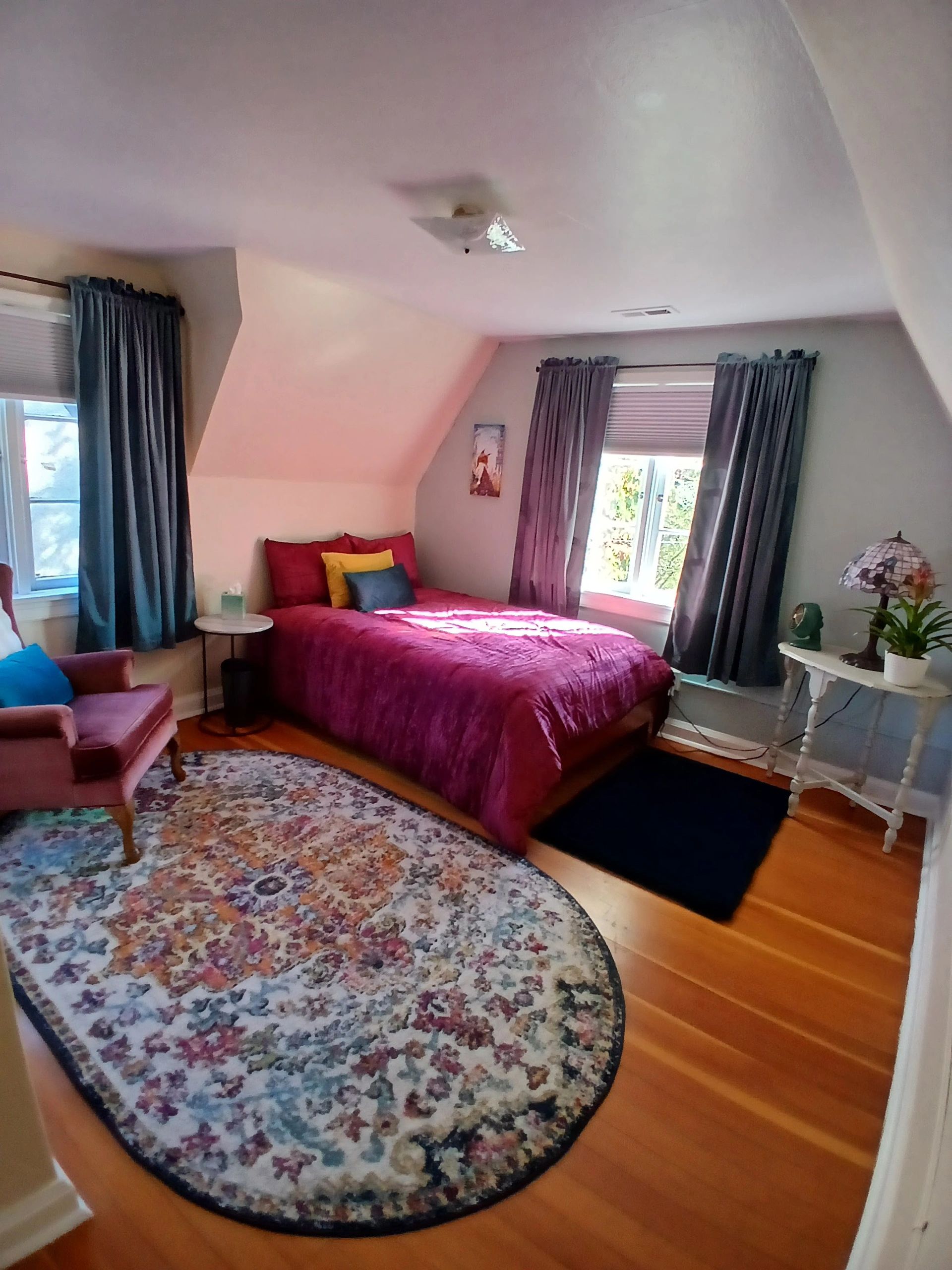 2nd floor, cozy room with angled ceilings, shared single occupancy restroom, Full size mattress, hardwood floor, soft velvety textiles, Anker speaker, and an elevated view of our backyard trees.
