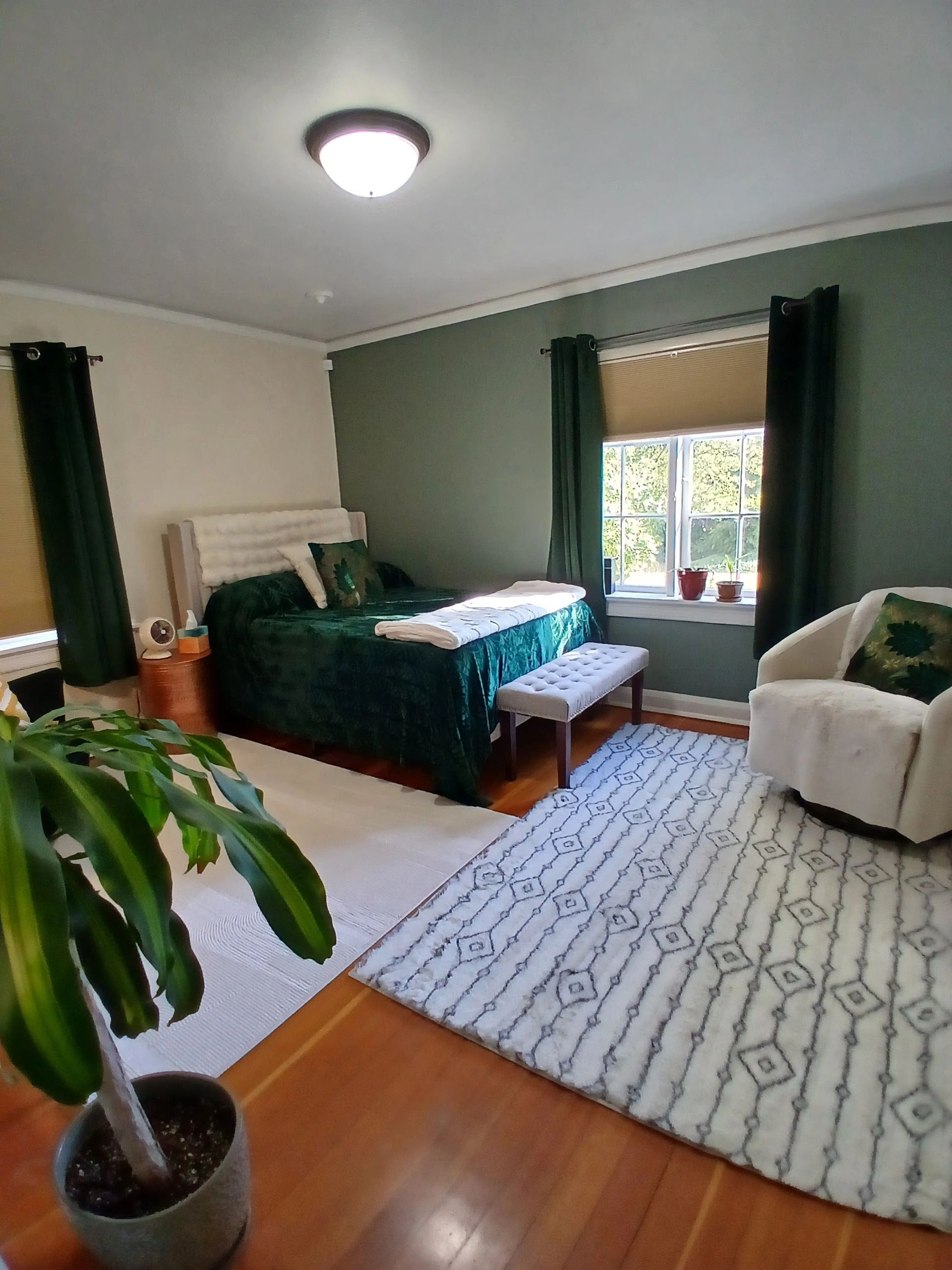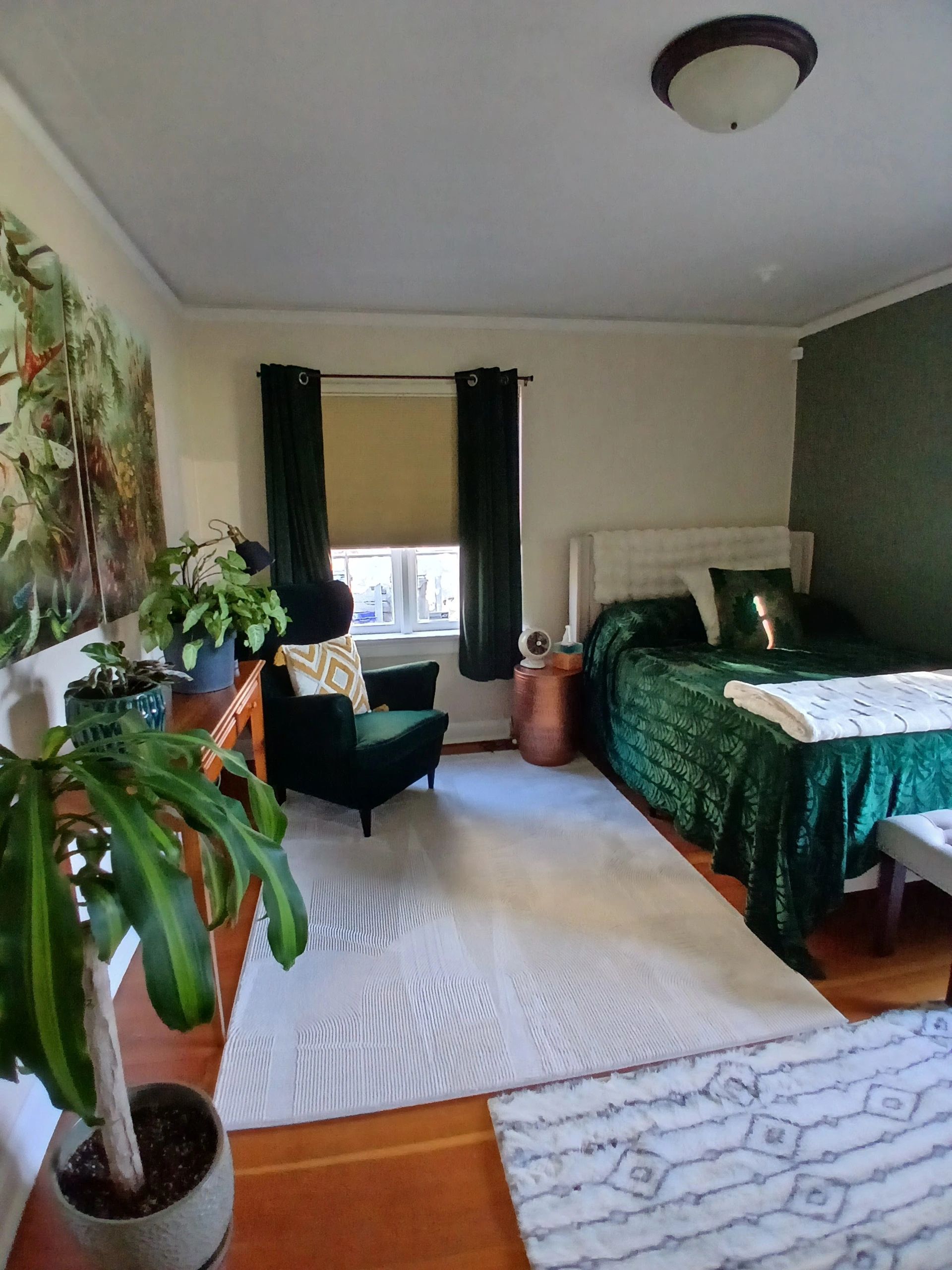 First floor easy access, private bathroom, Full size memory foam mattress, hardwood floors, tall ceilings, soft velvety textiles, Bose speaker, and a view of our majestic willow tree.