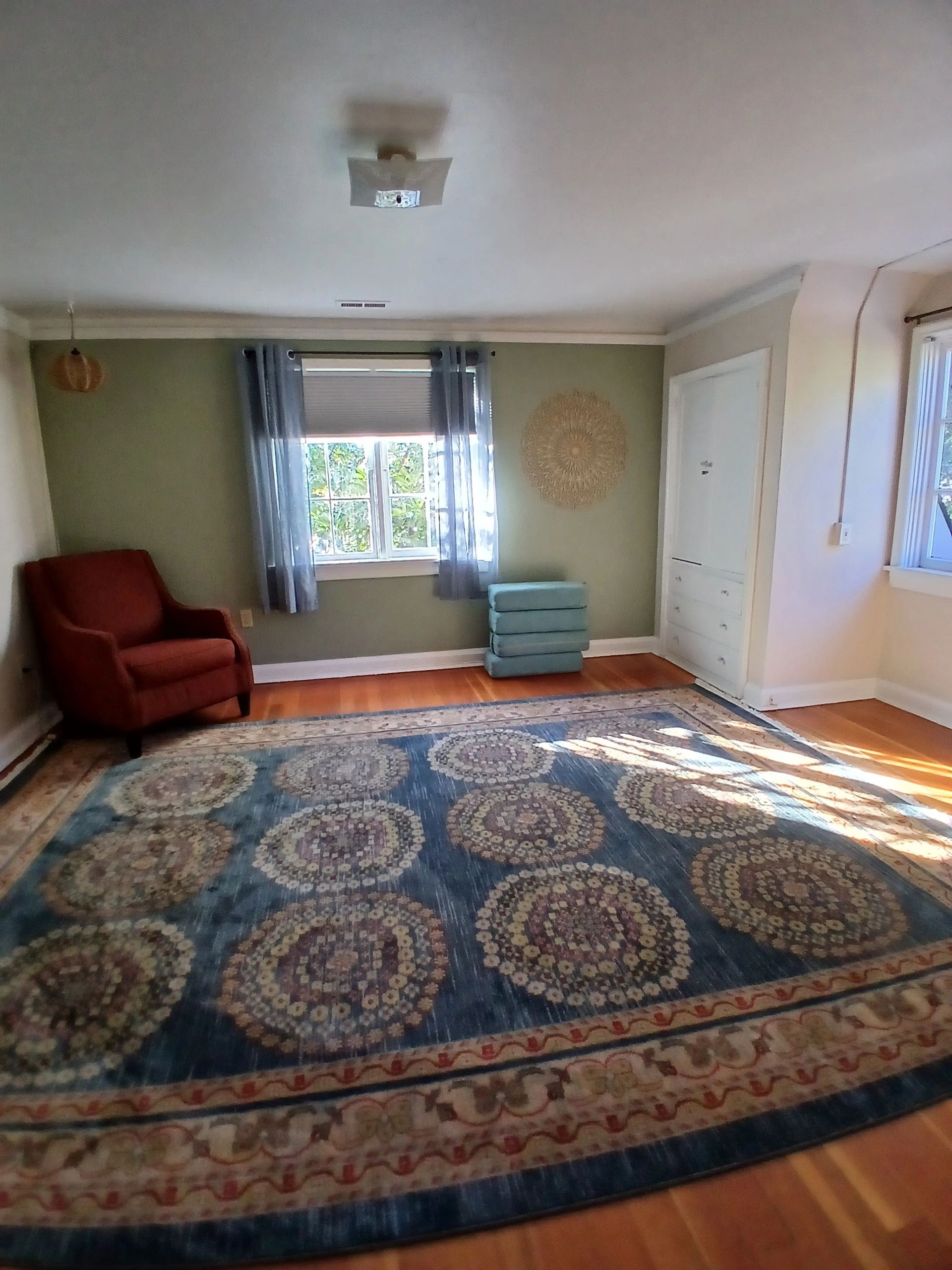 Though easily accessible, the center feels private and tucked away—a peaceful retreat separate from the pace of everyday life. Each room has been thoughtfully arranged for comfort and tranquility. With original hardwood floors, flourishing plants, and abundant natural light, the space invites the presence of the natural world into every session. Views of trees and sky create a grounding yet expansive atmosphere, fostering a sense of calm and openness. Through careful design, natural beauty, and a timeless sense of serenity, this space welcomes you to arrive as you are and embrace what’s possible.